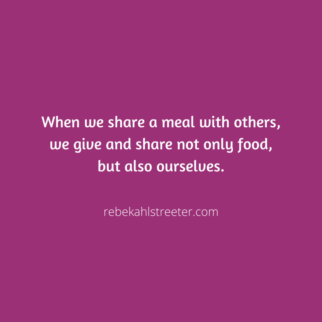While food engages our physical senses, it also communicates to our spirits. A shared meal speaks of generosity from the host and participants, the time, care, and resources spent, and the meeting of human needs for sustenance and fellowship. When we share a meal with others, we give and share not only food, but also ourselves.